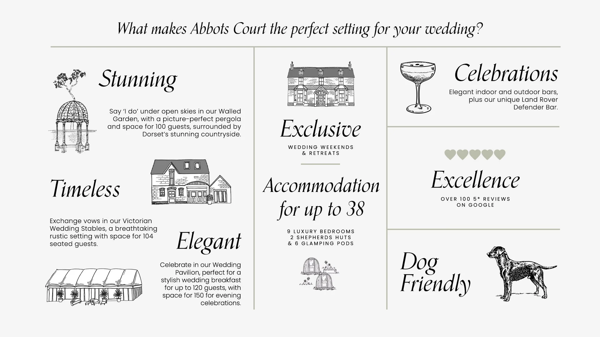 With our enchanting walled garden, grand Victorian wedding stables, and elegant pavilion, Abbots Court has been a setting for love, laughter, and unforgettable wedding celebrations for generations.
